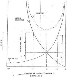 We should be satisfied about certain logical percent of down time, but “Logical” is not in our dictionary, as stated in the second principle of preventive maintenance, we should use the “Scientific Method of Prevention. This certain percent of down time can be calculated from the economical side. Looking to the following diagram we see two curves. The first represents the cost of preventive maintenance program which is increasing as the percent of stoppage hour decreases. The second is the cost of working hours lost due to stoppage, it increases as stoppage hours increases. Summing up the two curves we get the total cost curve which has one minimum peak represents the minimum total cost which will be at Z% of stoppage hours with respect to total working hours.